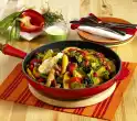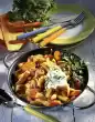 Deglaze with 1/2 litre water. Cook in a closed pot for about 15 minutes. Add another 1/4 litre of water, cover and braise for another 15 minutes. Season goulash to taste, refine with crème fraîche.