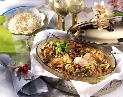 Pour the meat and mushroom cream into a greased ovenproof dish. Grate the cheese and sprinkle over it. Bake in a preheated oven (electric cooker: 200 °C/circulating air: 175 °C/gas: level 3) for 30-35 minutes until golden brown