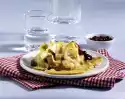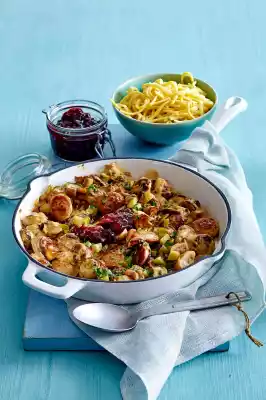 Heat the oil in a pan and fry the sausages for about 10 minutes while turning. After about 5 minutes add mushrooms and onion. Deglaze with 100 ml water, bring to the boil and stir in cream cheese. Sprinkle with gherkins and serve with cranberries. Spätzle taste good with it.