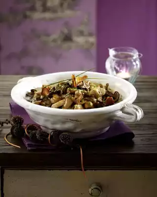 Clean and sanitize the mushrooms. Chanterelles and chestnuts wash and clean. Larger mushrooms may need to be halved. Wash meat, dab dry and cut into strips