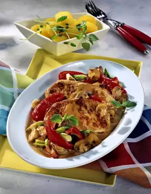 Season with salt, pepper and marjoram and remove. Add the mushrooms to the hot frying fat and fry well. Add bell peppers and spring onions, fry briefly and season with salt, sweet paprika and pepper. Deglaze with stock and cream, bring to the boil and stir in the sauce thickener. Place the meat in the hot sauce, cover and simmer for about 5 minutes. Arrange on a plate and garnish with fresh marjoram as desired. Add boiled potatoes extra