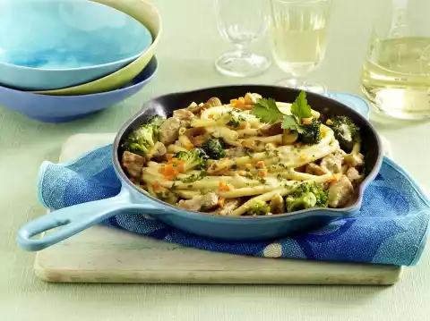 Cook broccoli in boiling salted water for about 5 minutes, drain and rinse with cold water. Heat 4 tablespoons of oil in portions in a large coated pan. Brown the meat in 2 portions over high heat, season with salt and pepper and remove. Fry the mushrooms in the frying pan for 2-3 minutes. Add diced carrots, onion and garlic and fry briefly. Add meat and deglaze with white wine. Add stock and cream. Simmer for about 10 minutes at medium heat, stirring occasionally. Prepare pasta in boiling salted water according to package instructions, drain and allow to drain. Wash parsley, shake dry and chop finely, except for a few leaves for garnishing