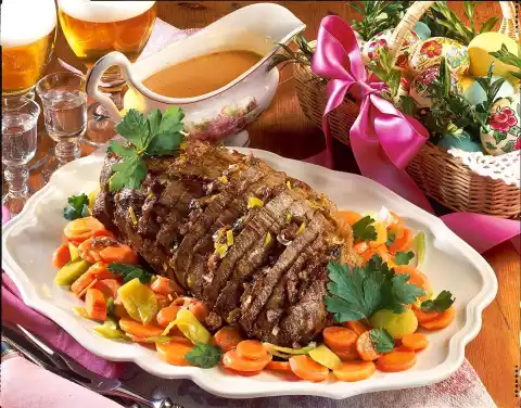 Braise the roast in the sauce for another 50-60 minutes. Cook carrots in boiling salted water for about 15 minutes. Add leek after about 10 minutes of cooking time and cook until done. Remove the roast from the sauce and arrange on a plate with the vegetables. Serve garnished with parsley as desired. Add sauce extra