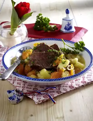 Add the vegetables to the meat in the pot and simmer for another 45 minutes. Wash the parsley, dab dry. Pluck off leaves and chop finely, except for something to garnish. Remove meat from the pot, remove fat and bones.