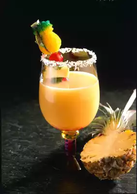 Put passion fruit juice, pineapple juice, rum and cream of coconut in a shaker. Add some ice cubes and shake everything vigorously (shake). Dip a glass with the rim first in some fruit juice, then in grated coconut. Strain the exotic drink into the prepared glass and serve immediately with a fruit skewer of fresh pineapple, cocktail cherries and lemon balm leaves.