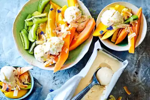 For the salad peel the fruits. Halve the papaya and remove the seeds. Halve pineapple, remove stalk. Cut the mango pulp from the stone. Cut all fruits into narrow slices. Mix with lime peel, lime juice and 2 tablespoons honey. Serve with butter milk ice cream. Decorate with coconut chips and flowers as desired.