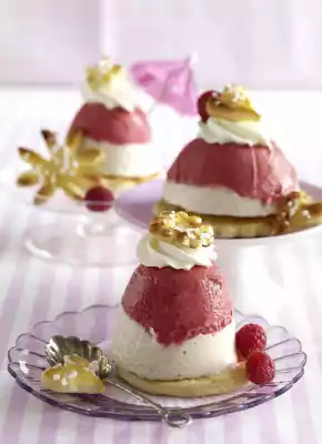 Peel the bananas, weigh 150 g of flesh and cut into small pieces. Put bananas with lemon juice, 125 g and 75 g yoghurt in a high bowl. Puree finely with a hand blender and mix for approx. 3 minutes with the blender until foamy, so that a fine-creamy foam is created. Wash and sort the raspberries, drain well. Puree with 125 g fruit ice cream magic and 75 g yoghurt as well as the banana mixture. Rinse 6 moulds (150 ml each; upper rim approx. 8 cm Ø) with water.