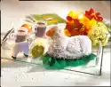 Roast the almonds in a pan without fat until golden brown. Peel and slice the kiwis. Drain apricots and cut into slices. Cut the ice cream cake into 8 pieces. Arrange kiwis, apricots, cocktail cherries, biscuits and 2 pieces of ice cream cake on 4 dessert plates. Sprinkle with almonds and dust with icing sugar