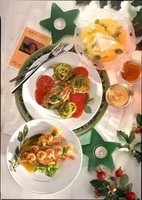 Peel the orange so that the white skin is completely removed. Remove the fillets from the parting skins. Peel the kiwis, first cut into slices, then into strips. For the zabaglione, shortly before serving, beat the egg yolks, sugar and white wine in a hot water bath until thick. Arrange fruit, ice cream and sauce on plates decorated with lemon balm