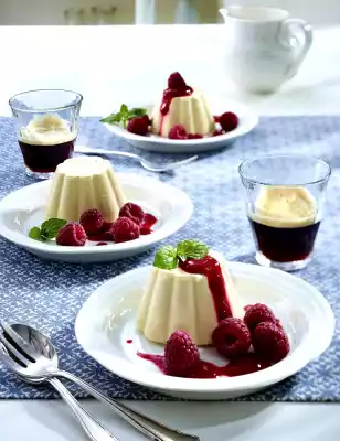 Wash mint, shake dry. Sort the raspberries. Puree 2/3 of the raspberries and 1 teaspoon sugar and pass through a sieve. Turn out the parfait onto plates and decorate with raspberry sauce, remaining raspberries and mint