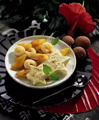 Drain Lychees on a sieve. Peel the mango, cut the flesh off the stone and cut into pieces. Melt the sugar in a pan. Deglaze with plum wine, orange juice and 2 tablespoons of water.