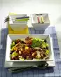 Clean the onion, cut in half. Wash the meat. Boil both with 1 1/2 l salted water, peppercorns and bay leaf. Simmer for about 45 minutes. Cool down meat. Cook peas in the broth for 3 minutes, drain (use broth for other purposes)