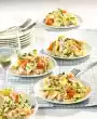 Remove chicken meat from skin and bone, cut into pieces. Cut the eggs into small pieces. Mix both with prepared ingredients and arrange on the salad boats. Bread goes well with it
