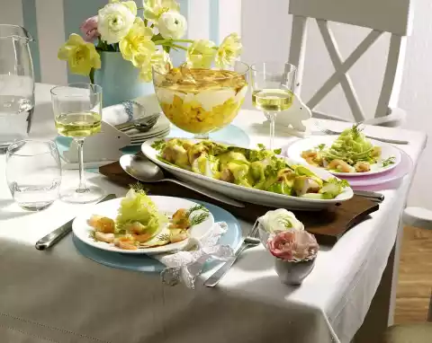 Rinse shrimps briefly and defrost. Clean and wash iceberg lettuce. Cut into slices or triangles and pin with wooden sticks. Stir mustard cream and 6-8 tablespoons of water until smooth. Rinse shrimps again and drain.