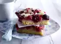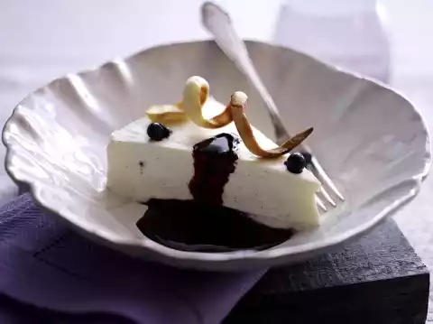 Remove the mould edge. Cut open the cake with a hot rinsed knife and freeze the rest immediately. Decorate the cake pieces with berries, sauce and biscuits.