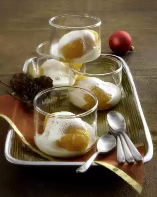 Cut the clementine cream into dumplings and serve in glasses with milk foam