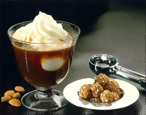Put ice cream in a glass. Pour coffee and amaretto on top. Serve decorated with a cream topping.