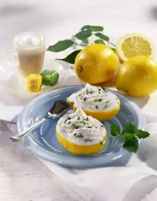 Set aside some lemon balm for decoration. Pluck the remaining leaves from the stems, wash and chop finely. Stir into the cream. Pour the cream into a piping bag with a large star-shaped spout and squirt into the lemon halves. Let it freeze again for at least 5-6 hours. Arrange 2 lemon halves on each plate and serve decorated with lemon balm
