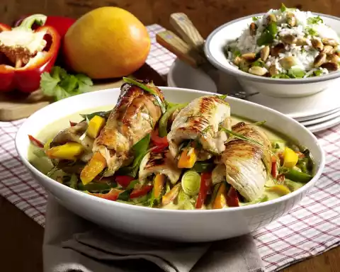 In the meantime, mix the starch with a little water until smooth and use it to thicken the curry slightly, bring to the boil again. Fold the mango into the curry, season with salt and pepper and add the roulades.