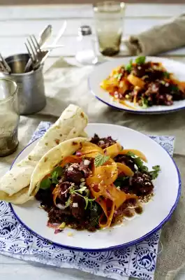 Wash the herbs and shake dry, pluck off the leaves and mix with the mince. Season to taste. Serve minced meat with carrot salad. Sprinkle with sesame seeds. Indian flatbread (chapati) tastes good with it.