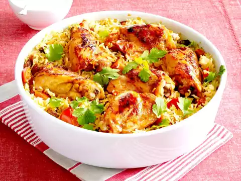 Place the chicken on the rice and pour broth over it. Cover the casserole dish with foil and cook in the preheated oven (electric cooker: 225 °C/ convection oven: 200 °C/ gas: see manufacturer) for approx. 45 minutes. Remove from the oven, cover and leave to rest for approx. 10 minutes.