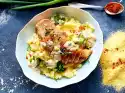 Spread around the clubs. Pour tomato cream over them so that the legs and potatoes are covered with sauce. Be sure to cover with tinfoil, which sprays tomato sauce. Cook in a hot oven for about 1 1⁄2 hours.