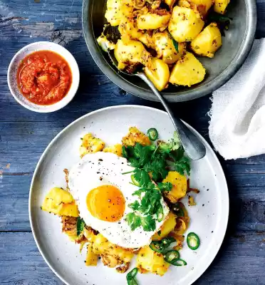 Heat 2 tablespoons of oil in a second pan. Fry 4 fried eggs in it, season with salt. Wash coriander, shake dry, pluck leaves. Season potatoes with salt and pepper. Arrange with fried eggs and serve sprinkled with chilli rings and coriander leaves.