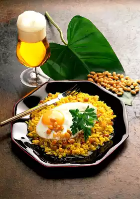 Grate the salt from the nuts. Fry the nuts in 1 tablespoon of fat. Add rice, spice mixture and 400 ml water, bring to the boil. Cover and allow to swell for 15-20 minutes. Fry the eggs in the remaining fat.