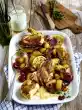 Cut the leaves into fine strips, except for a little to garnish, and mix with yoghurt, 2 tablespoons of olive oil, lemon juice and sesame paste. Season with salt and pepper. Arrange peppers and sesame dip, garnish with mint.