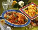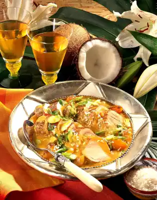 Drain the apricots, collect the juice. Halve the apricots. Peel and chop the garlic. Line a sieve with a cloth, add coconut with liquid, squeeze the grater, collect the coconut milk.3. Fry in hot oil. Sauté garlic. Salt and sweat curry in it. Gradually deglaze with coconut milk and apricot juice, bring to the boil. Add lemon peel and possibly ginger. Cover and stew for 15-20 minutes
