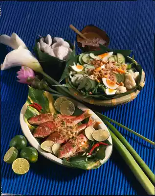Sprinkle with lime juice and rub with salt. Heat the oil in a pan and fry the fish at medium heat for about 3 minutes on each side. Remove the fish from the pan and keep warm. Fry the shallots, garlic, ginger, sambal oelek and lemongrass in the frying fat for about 2 minutes.