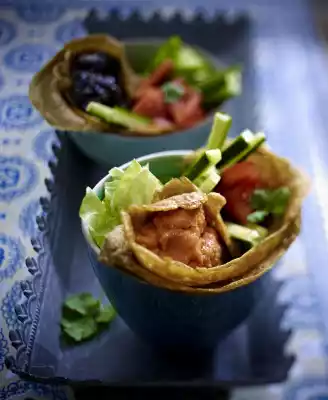 Info: Traditionally 1 plate is served for each guest. For this purpose, place 1 flat cake on each plate, arrange the dips and the vegetables on it. The rest of the flat cakes are rolled up small and placed on top. Then you use the flat cakes as eating tools. When the guest has eaten the flat cake, which is used as "base", the meal is finished