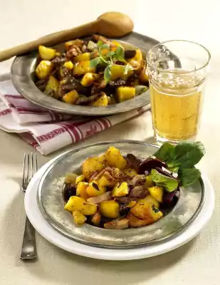 Wash and pluck the marjoram and chop it coarsely, except for a little bit. Add the meat to the potatoes and fry for about 5 minutes. Season to taste. Serve and garnish with the rest of the marjoram. Serve with a salad of lamb's lettuce and beetroot