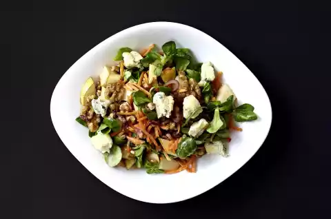 For the dressing, mix vinegar, salt and pepper and fold in 5 tablespoons of oil. Clean, wash and dry lamb's lettuce. Peel and roughly grate the carrot. Mix salad, carrot and croutons with the dressing. Mix in the pear mixture. Cut the gorgonzola into pieces and sprinkle on top