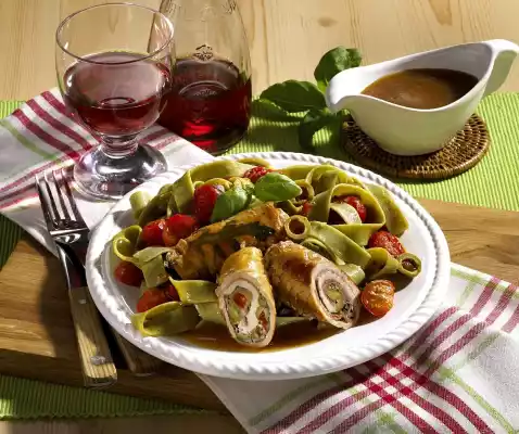 Heat the oil in a frying pan. Sauté the rolls in it vigorously while turning. Deglaze with wine and stock, bring to the boil, cover and cook for about 15 minutes. Cook pasta in boiling salted water according to package instructions.