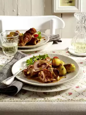 Remove the roulades from the sauce and keep warm. Cut the butter into small cubes, add to the sauce bit by bit and mix with a whisk. Arrange salad, potatoes, roulades and sauce