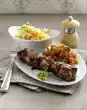For the salad, wash and halve the tomatoes. Clean, wash, shake dry and pluck the arugula smaller. For the vinaigrette, peel and finely dice the onion. Whisk vinegar, onion, salt and pepper.