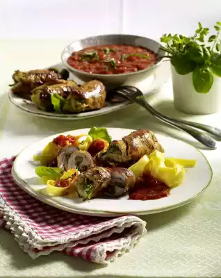 Stir in the herbs and simmer for about 5 minutes. Season sauce with salt and pepper. Arrange Involtini with noodles and sauce on plates. Garnish with basil.