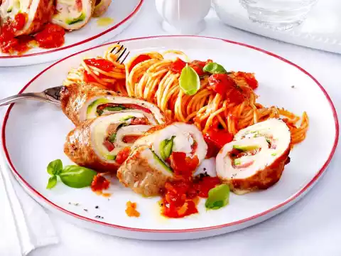 Season tomato sauce with salt, pepper and a little sugar. Drain the pasta and mix with the tomato sauce. Cut Involtini into slices. Meat and T