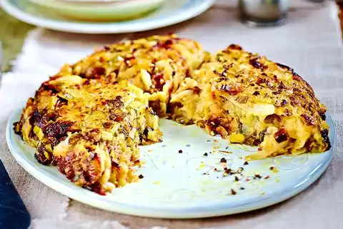 Heat 2 tablespoons of oil in a frying pan. Press the potato mixture in it to a flat cake. Brown over medium heat for about 5 minutes. Stir everything briefly, press into shape again and brown for another 5-10 minutes. Slide the flat cakes out of the pan onto a flat lid to turn them over. Spread 2 tbsp. oil in the pan and fry the pancake on the other side for 5-10 minutes.