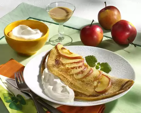 Drizzle apples with lemon juice. Whip cream, vanilla sugar and 3 tablespoons of liqueur until semi-stiff. Heat 1/2 tablespoon of oil in a pan (16 cm Ø). Put 1/4 of the apple slices in it. Pour 1/4 of the dough over them and bake for about 2 minutes until golden brown.