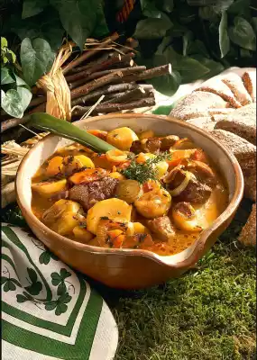 Wash the leg, dab dry and remove the meat from the bone. Remove tendons and fat and cut into bite-sized cubes. Cut bacon into fine strips. Wash, peel and slice potatoes and carrots. Peel onions and cut into rings. Wash thyme and, except for 2 stems for garnishing, pluck off leaves. Heat the oil in a pan, crisp up the bacon and take it out. Sauté the lamb in portions in hot fat. Remove. Deglaze the meat with some stock. Layer vegetables and meat in a large pot. Season each layer with salt and pepper, sprinkle with thyme and bacon. Pour in broth and deglazed meat. Stew in a closed pot at medium heat for 1-1 1/2 hours. Season the finished stew again and serve garnished with thyme
