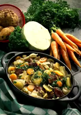 Peel, wash and chop the celery. Peel, wash and slice carrots and potatoes. 30 minutes before the end of the cooking time, add the prepared vegetables, salt, pepper and caraway seeds. In the meantime, wash parsley, dab dry and chop finely.