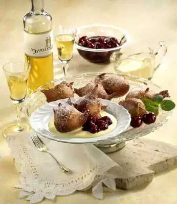 Mix flour, 60 g sugar, baking powder and salt in a bowl. Add eggs, yoghurt and grappa and stir everything into a thick, viscous dough. Heat the oil. Use 2 tablespoons to cut the dough into cams and let them slide into the oil. Fry 12 doughnuts in 3-4 portions for 4-5 minutes each. Drain on kitchen paper and turn in 50 g sugar while still warm. Dust with icing sugar and serve with compote and sauce. Decorate with mint and cherries