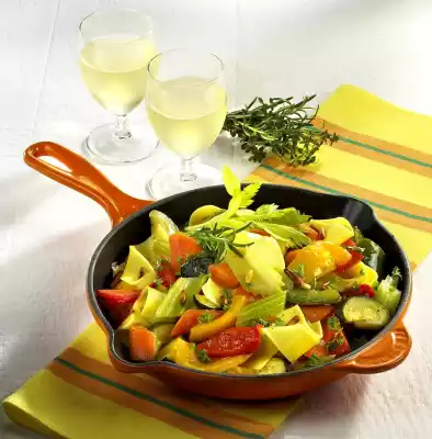 Pour in wine and stock, add thyme and braise everything for 10 minutes. Wash and chop the parsley. Season vegetables with salt and pepper. Drain the pasta and fold into the vegetables. Add pesto to the vegetables. Garnish the vegetable pan with rosemary and celery green and serve