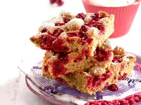 Put the dough into a greased and floured fat pan of the oven (approx. 32 x 39 cm) and spread it. Spread the rest of the cherries and amarettini on top. Bake in the preheated oven (electric cooker: 175 °C/ convection oven: 150 °C/ gas: level 2) for approx. 40 minutes. Let the cake cool down in the fat pan on a cake rack. Dust with icing sugar as desired. Whipped cream tastes good with it
