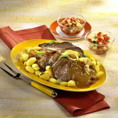 Remove the roast, keep warm. Dissolve roast with 100 ml water, pass through a sieve and add to the tomato mixture. Bring to the boil briefly, season with salt and pepper and refine with cream. Cook gnocchi in hot butter for about 4 minutes while turning. Cut the roast open and serve with sauce and gnocchi. Serve with a fresh salad