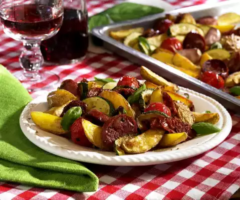 Skin the salsiccia and cut into slices. Place the slices of courgette and garlic on the tray 20 minutes before the end of cooking. Place the tomatoes and salsiccia on the baking tray about 5 minutes before the end of cooking. Wash the basil, dab dry and cut the leaves from one stalk into strips.