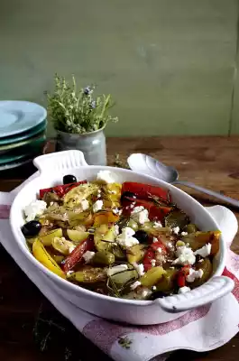 manufacturer) cook for about 45 minutes. Crumble the sheep's cheese finely. Remove the mould from the oven and arrange. Sprinkle olives and sheep's cheese over the casserole.