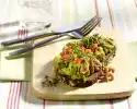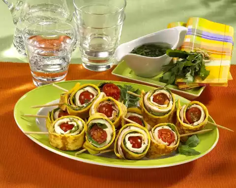 Roll up the pancakes and cut each pancake into 4 slices. Put 2 pancake snails on each wooden skewer. Mix vinegar with 4 tablespoons of water and season with salt and pepper. Add 2 tablespoons of oil. Cut the remaining rocket into fine strips and stir in. Drizzle the vinaigrette over the pancake snails